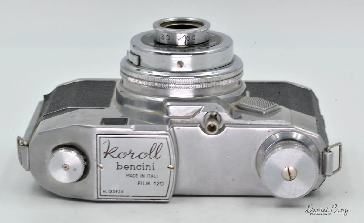 The interesting thing that caught my eye about this camera was the aluminum body. I had previously seen these in books and thought I'd jump on it if the right opportunity presented itself to get one at a reasonable price. With that said, I want to tell you about an exciting camera from Italy, the Bencini Koroll, a 645 format 120 camera.