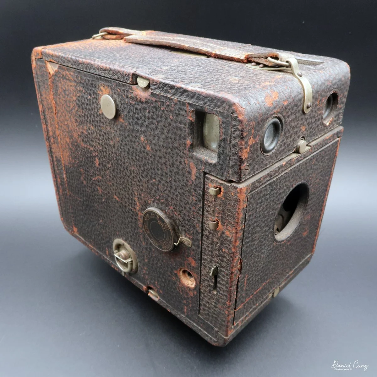 The LuxBox was reissued from 1952 to 1954, which is when mine was made. It’s an all-metal camera without a leather covering, with a frosted Havana-colored paint finish. There is a small vertical eye-level finder on top for composing your shot. This version takes 6x9cm negatives with 620 film, which is very similar to 120 film but uses a different spool size.